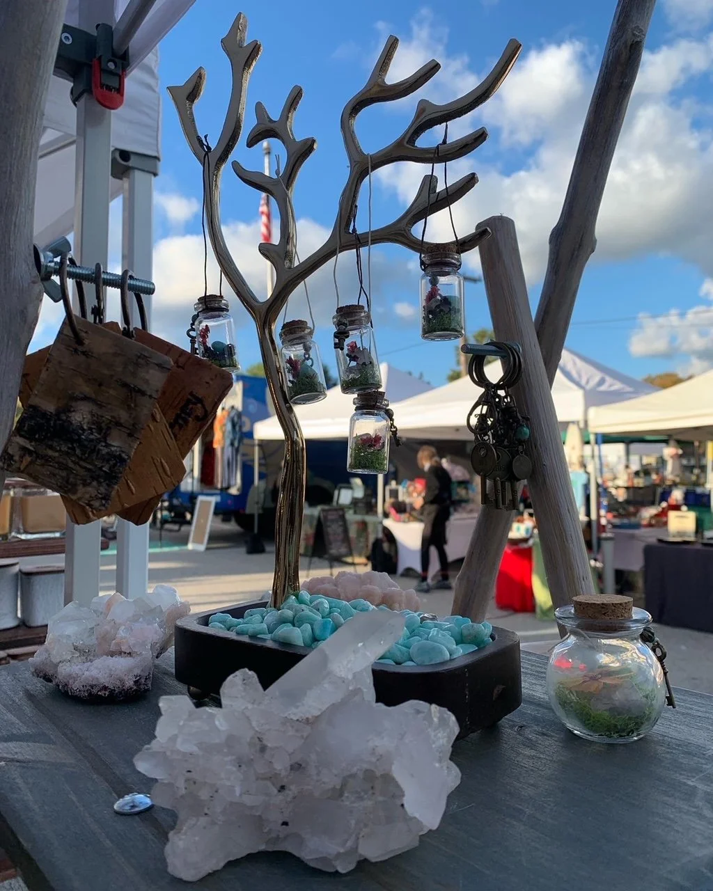One of the creations I owe to the inspiration of the market are my garden terrariums. I’ve been really enjoying the process of experimenting with plants, making tiny worlds where small crystals have a place to reside. It provides a context for the crystals, and offers an element of nature to carry indoors just in time for the coldest phase of the year. This process led to new ideas about what Christmas ornaments could be, and I began making floral terrariums in both clear glass and plastic bulbs. Having absolutely no idea whether anyone would find them interesting, I made as many as time allowed for and set up a large garland to hang them from. They framed the entrance to our tent for the Mistletoe Market, enveloping the space like magical floating orbs. I was elated to see that they caught the fascination of many people, and became our most popular item of the final market day!